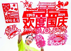 图 河北唐山学生在创作以“迎国庆”为主题的剪纸作品。