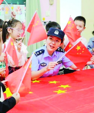 图 浙江省台州市三门县公安局珠岙派出所民警在镇中心幼儿园向小朋友讲解国旗知识。