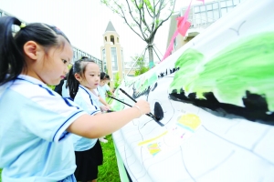 图 浙江湖州八里店镇中心幼儿园的孩子们在长卷上描绘长城。