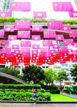 图 香港利东街悬挂着五星红旗和紫荆花区旗。