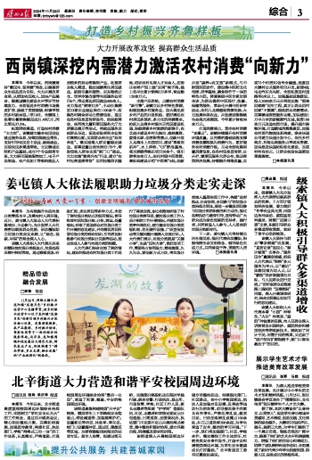 打通消费堵点,筑牢农村消费“支撑点”。该镇持续提升农村消费环境质量,以完善的基础设施支撑消费意愿转换为消费行为,更好服务农村消费升级。主动全面收集闲置房源信息,在各村信息宣传群、公开栏、镇便民服务大屏公布,推动商贸经济发展。持续提升网络质量,实现72个村居5G信号全覆盖。适度加大镇村公共服务项目开支,新建4处电动汽车充电桩,全面拓宽进村道路至6米以上。加强基础设施建设,投入2000余万元分两批实施“照亮回家路”民生工程,真正让群众回村回家“不摸黑”。瞄准群众消费需求,完善镇域商贸服务功能,加快建设1万平方米的新能源汽车城,投资100余万元改造农贸市场,提升超市购物环境,打造镇域消费集聚区。加强农村现代物流体系构建,联合快递公司建立快递分发中心,依托乡村商店、村级电商服务点等现有资源,加快推进快递站标准化建设,实现村村有站点,让群众收发快递更加便捷高效。