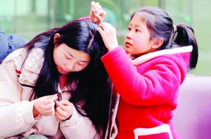 图 1月26日,在郑州东站候车大厅,一名小朋友在候车时帮妈妈拔白头发。
