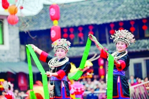 图 人们在贵州省锦屏县隆里古城举办的元宵节“村晚”活动中展示花带。