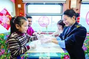 图 沈阳客运段客运一队职工在Z12次列车上和旅客体验制作元宵。