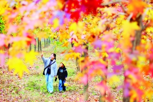 11月15日,游客在姜屯镇东滕城村的枫树林中游玩。初冬时节,东滕城村的枫树林迎来最佳观赏期。游客们三五成群漫步林间,或驻足观赏,或合影留念。近年来,该村依托自然生态资源,打造特色乡村旅游景观,吸引了周边市民前来游玩,感受乡村生态之美。