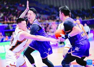 1月26日,北京控股队球员沈梓捷(左二)、邹雨宸(右一)和长白山恩都里队球员曾繁日(左一)在比赛中拼抢。